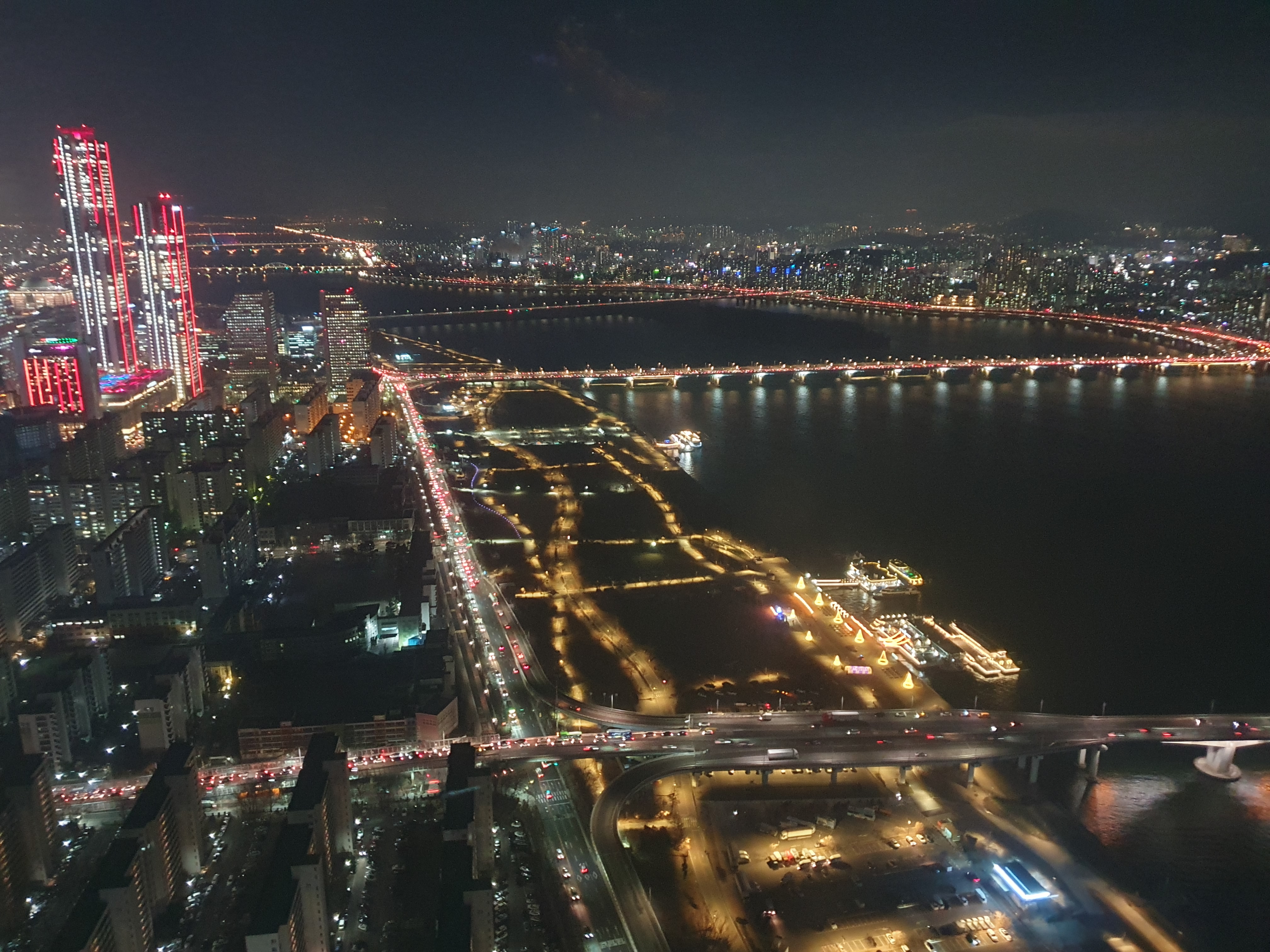 그리고 63빌딩 고층부에 위치해 있어서 전망도 보너스로 함께 볼 수 있는데, 한 가지 팁을 주자면 날씨가 추운 날이 전망이 좋을 가능성이 높다. 날씨가 추울 때는 대기의 흐름이 빨라서 미세먼지가 없다고, 대기화학 강의에서 배운 기억이 있다. 실제로 추위와 미세먼지는 반비례의 모습을 많이 보인다. 전망까지 제대로 보고 싶다면 날씨가 추운 날을 골라가는 게 좋다. 그럼 잠시 전망 사진 감상 타임.