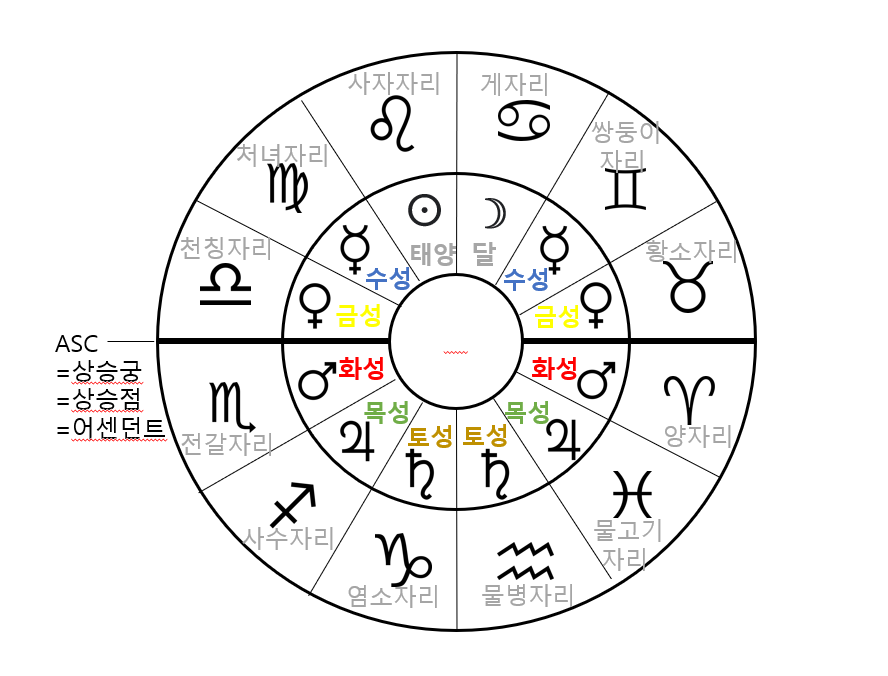 행성 기호는 차트 몇 번 보다 보면 금방 외워지니 사인과 그 사인의 로드를 외우는 것에 중점을 두는 것이 좋다.