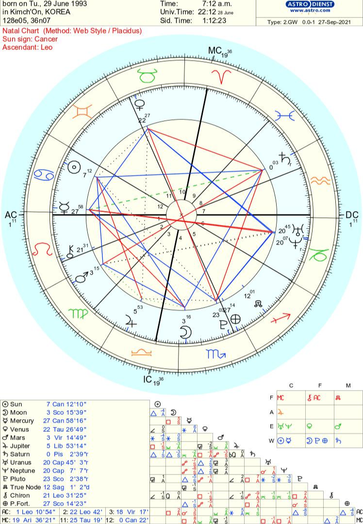 게자리는 달과, 토성은 12하우스와 닮아있으니 이렇게 애스펙트까지 보아도 처음에 12 하우스-게자리-태양만 가지고 했던 해석에서 크게 달라지지는 않는 것 같다.